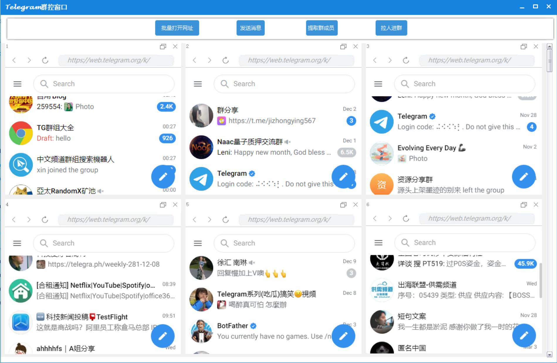 支持多个账号同时发送消息、提取群成员、拉人进群、关键词采集群、加群